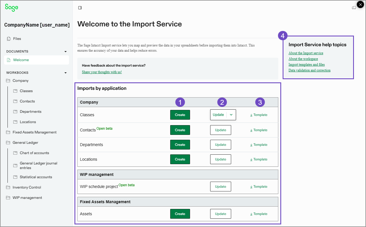 The Sage Intacct import service workspace is where you import new or updated information into Intacct, interact with imports you have already made, check on your offline job status.