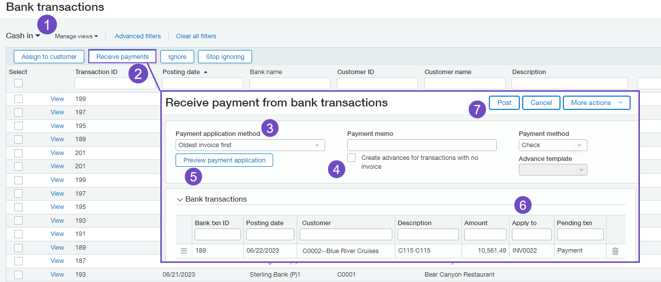 When a bank transaction has a customer assigned, you can receive a payment or create an advance. You can also receive payments in bulk. If there's no invoice for the customer, you can create an advance using the new AR advances template.