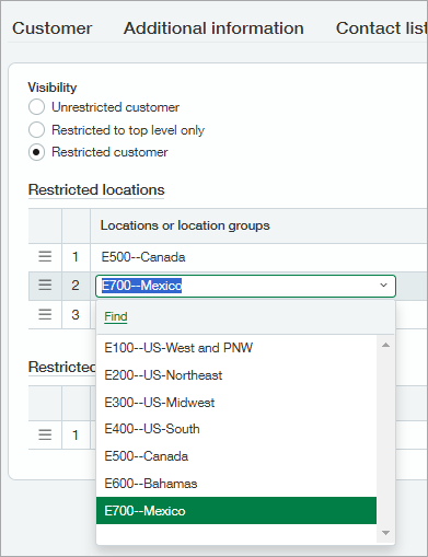 Selecting locations or departments for customer restrictions now works similarly to adding entries in the customer contact list. Add a new restriction on an empty line by selecting a location or department from the dropdown list. If you run out of empty lines, select Add. To remove a line, select Delete.