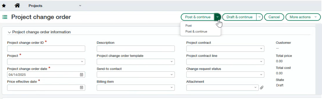 Now when you post or draft a project change order, you can select Post & continue (or Draft & continue) to keep your document open and continue working with no interruption.